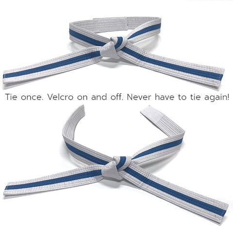 Hook and Loop Cub Velcro Belts for karate, taekwondo and jiu jitsu. Lets you keep your belt tied when taking it off. The velcro is located on the back end of the belt for a discreet non-invasive way to make your classes run smoother. Tie your students' belts one time and let the velcro do the rest.